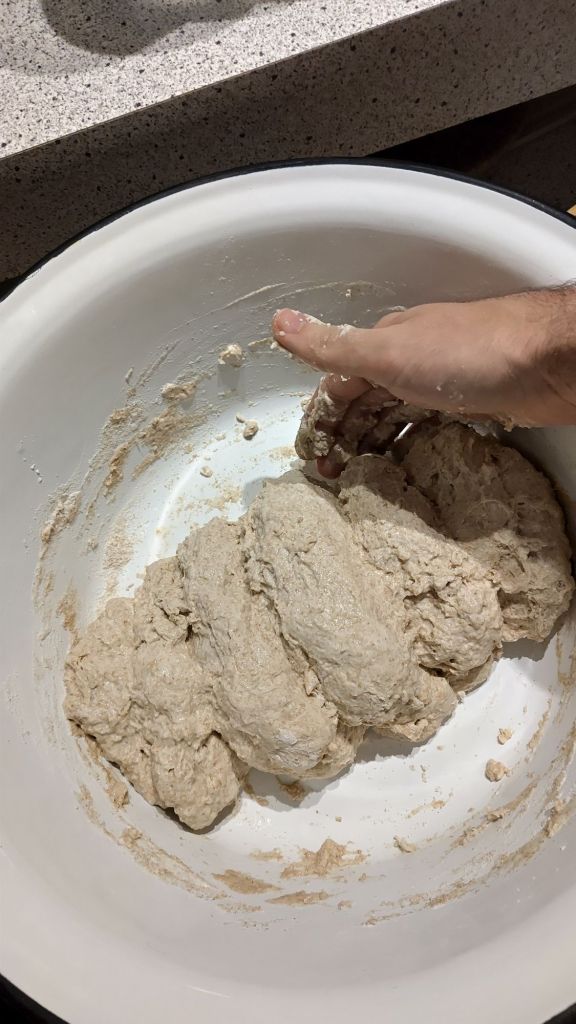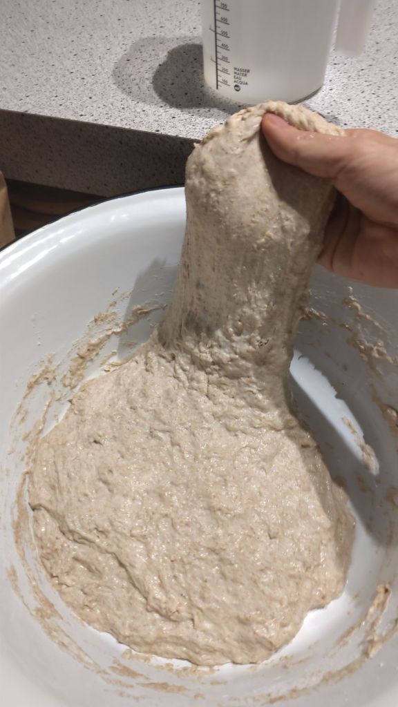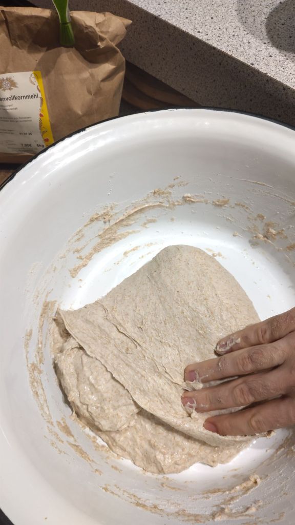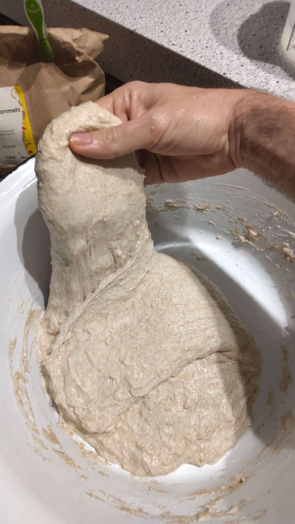 Der Teig wird durch den hohen Vollkorn-Anteil ein wenig klebriger und durch den hohen Wasseranteil etwas schwieriger zu handhaben sein als zum Beispiel der Kraftlaib #01 – außerdem müssen wir den Teig öfter Nachfalten. Mindestens vier mal, eventuell auch mehr, je nachdem, wie gut der Teig seine kugelartige Form nach dem Falten von alleine halten kann. Die Glutenstränge, die den Teig so dehnbar machen, bilden sich im Vollkornmehl nicht so stark aus, weswegen wir nachhelfen müssen, wenn das Brot schön aufgehen und die Krume schön fluffig werden soll.