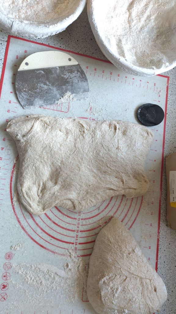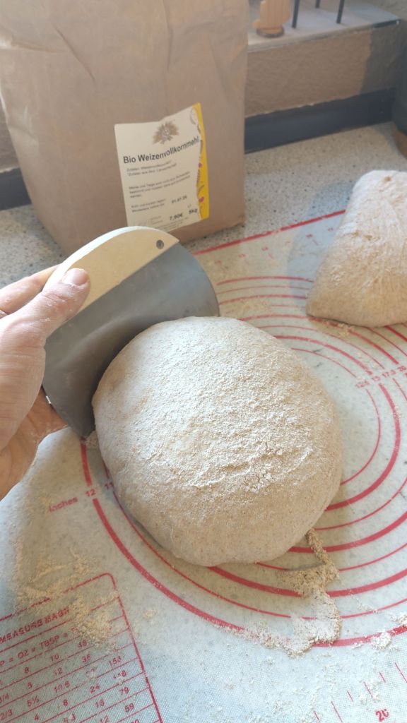 - Hat sich unser Teigvolumen mindestens verdoppelt (Bild 10), ist die Stockgare abgeschlossen und wir können den Teig in Laibe aufteilen und formen. Dazu bemehlen wir die Arbeitsfläche oder Backmatte und die Gärkörbe mit etwas Vollkornmehl (das nimmt nicht so schnell Feuchtigkeit auf und lässt den Teig nicht so kleben) und geben den Teig aus der Schüssel auf die Arbeitsfläche (Bild 11). Wir teilen den Teig in zwei möglichst gleich große Stücke (Bild 12).
