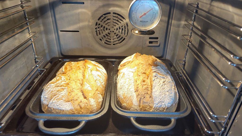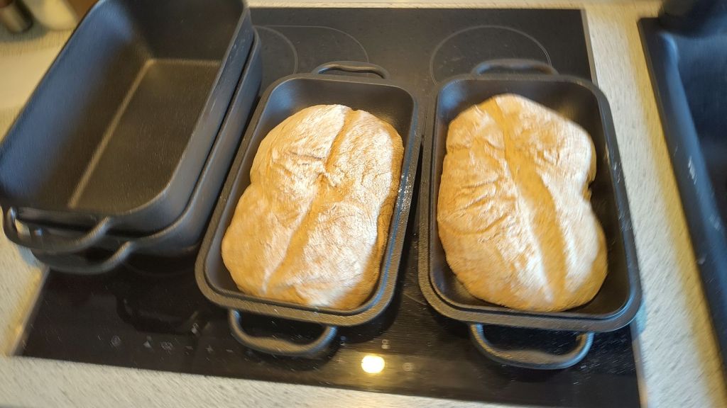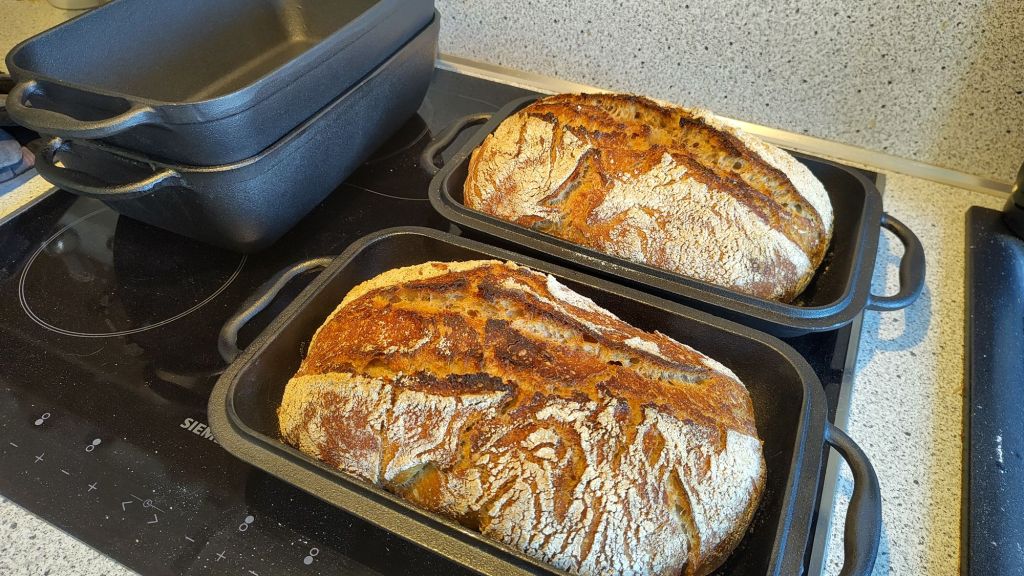 Zum Backen schließlich benötigen wir mindestens einen – optimalerweise zwei – gusseisernen Bräter. Ob eine klassische Cocotte oder, wie auf den Begleitbildern, ovale Brotbräter, ist dem eigenen Geschmack überlassen.