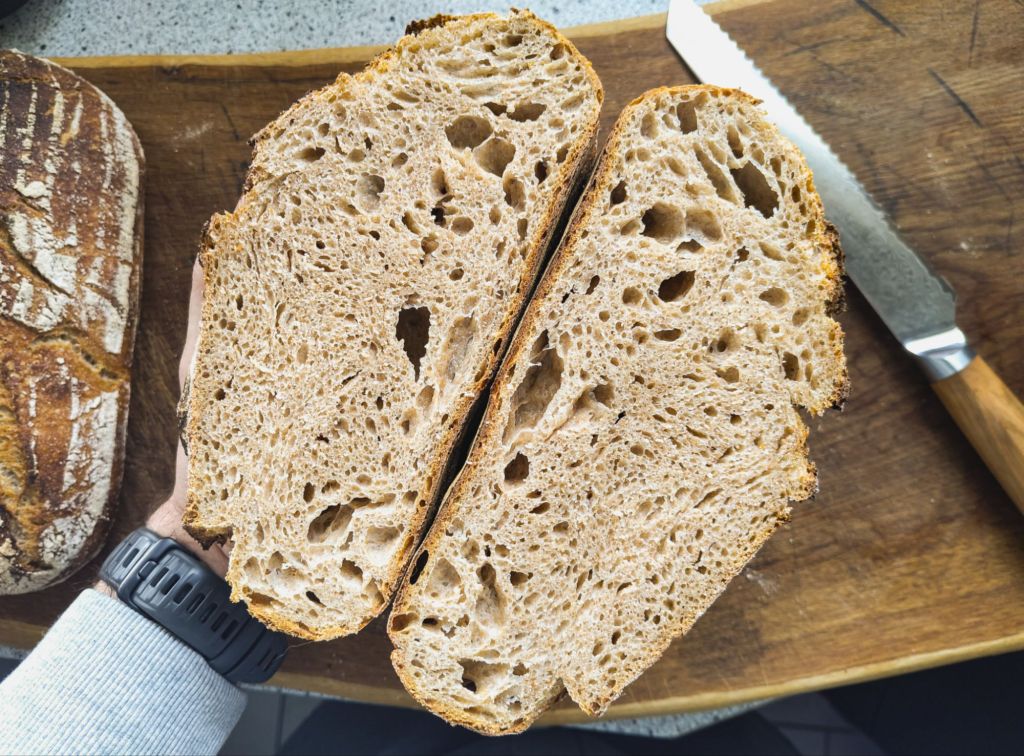 Wunderbar deftig, sehr bekömmlich und trotzdem zu allem passend – die leicht erschwerte Teighandhabbarkeit macht der Kraftlaib #02 dadurch mehr als wieder wett. Persönlich finde ich hohe Vollkorn-Anteile geschmacklich klasse und könnte ihn durchaus auch noch mehr erhöhen, die 60% stellen finde ich aber einen tollen Mittelweg aus den Vorteilen von Vollkorn und der „Leichtigkeit“ von hellem Mehl dar, sodass das beste aus beiden Welten hier vereint wird. Hervorragend schmeckt das Weizenvollkorn-Brot zum Beispiel mit Avocado, Tomatenscheiben und ein paar roten Zwiebelringen, garniert mit Pfeffer und Salz – einfach fantastisch!